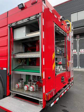 3.1 | 結構設計:鋁制框架結構。合理設計并增加器材放置空間,放置器材隔斷空間可調整。對車廂內部需要經常檢測的部件,在適當部位須安有活門,其他需要進入車內部檢查和維修的地方也應敞開或有可移動的板;器材箱應具有排水功能。具有自重輕、強度高,外觀平整美觀, 內部空間調整方便、空間利用率高、維護便捷等特點;主線路布置在骨架型材板內,可安全保護、防止損壞;內飾底板為3mm厚的氧化鋁花紋板,通過具有彈性、高粘接強度的進口連接密封膠與主骨架連接;前部為器材箱,中部為載液罐,罐體兩側為器材箱,后部為泵房。 |