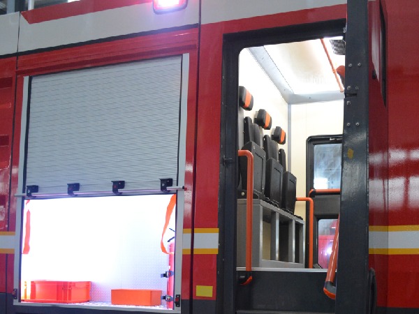 卷簾門:所有器材廂均采用拉桿式帶鎖卷簾門,卷簾門具有防水、防塵功能,防塵密封性能良好。每個器材廂內(nèi)均有 2 個 LED 白光照明燈帶,保證夜間使用時無任何死角,器材箱內(nèi)照明燈光隨著卷簾門開啟/關(guān)閉聯(lián)動**,在駕駛室內(nèi)也設有集中**開關(guān)。所有卷簾門均可采用同一把鑰匙開啟。卷簾門拉桿具有鎖止功能,兩邊加裝鎖扣,拉手、鎖銷堅固耐用,不易變形。卷簾門密封性能經(jīng)過水淋實驗,確保無滲漏現(xiàn)象。卷簾門兩側(cè)滑道采用一次成型滑道,內(nèi)固定滑塊可以防脫落。所有卷簾門都能夠在任意位置隨意停留,卷簾門采用氧化鋁合金型材裝配,耐酸堿鹽腐蝕性高,抗紫外線,卷簾門啟閉手柄下方留足安全操作空間,操作輕便靈活。